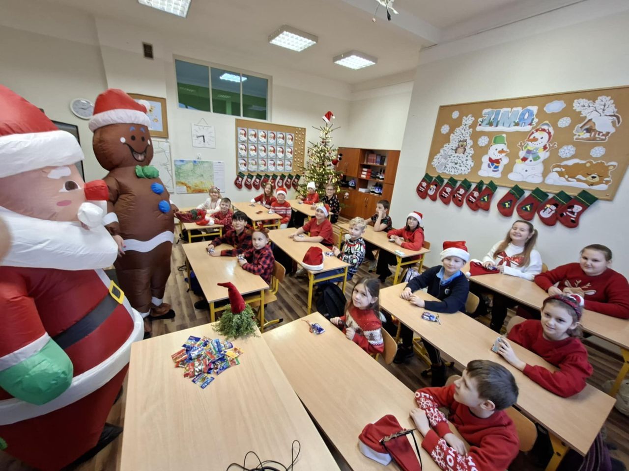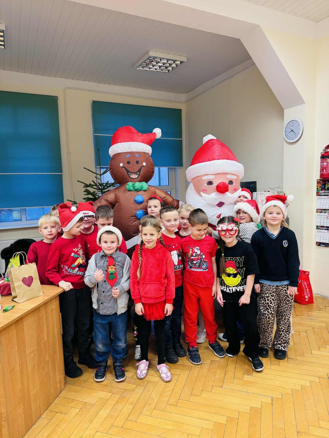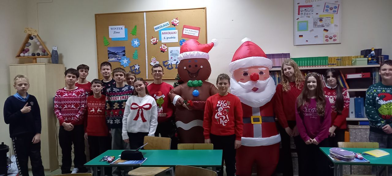 W piątek, 5 grudnia, w naszej szkole tradycyjnie obchodziliśmy mikołajki – jedno z najbardziej wyczekiwanych wydarzeń w roku. Już od rana na korytarzach panowała wyjątkowa atmosfera. Uczniowie pojawili się w czerwonych czapkach, mikołajkowych swetrach i błyszczących, reniferowych opaskach, a z głośnika rozbrzmiewały świąteczne melodie. Największą atrakcją dnia była oczywiście wizyta Świętego Mikołaja, który w towarzystwie swoich pomocników odwiedzał poszczególne klasy, obdarowując wszystkich świątecznymi słodkimi upominkami.