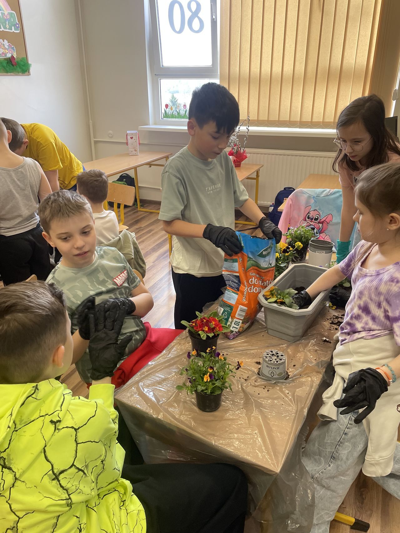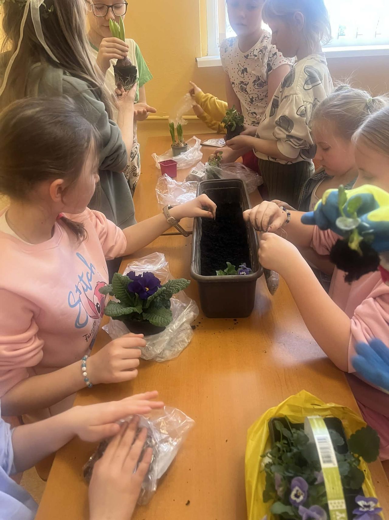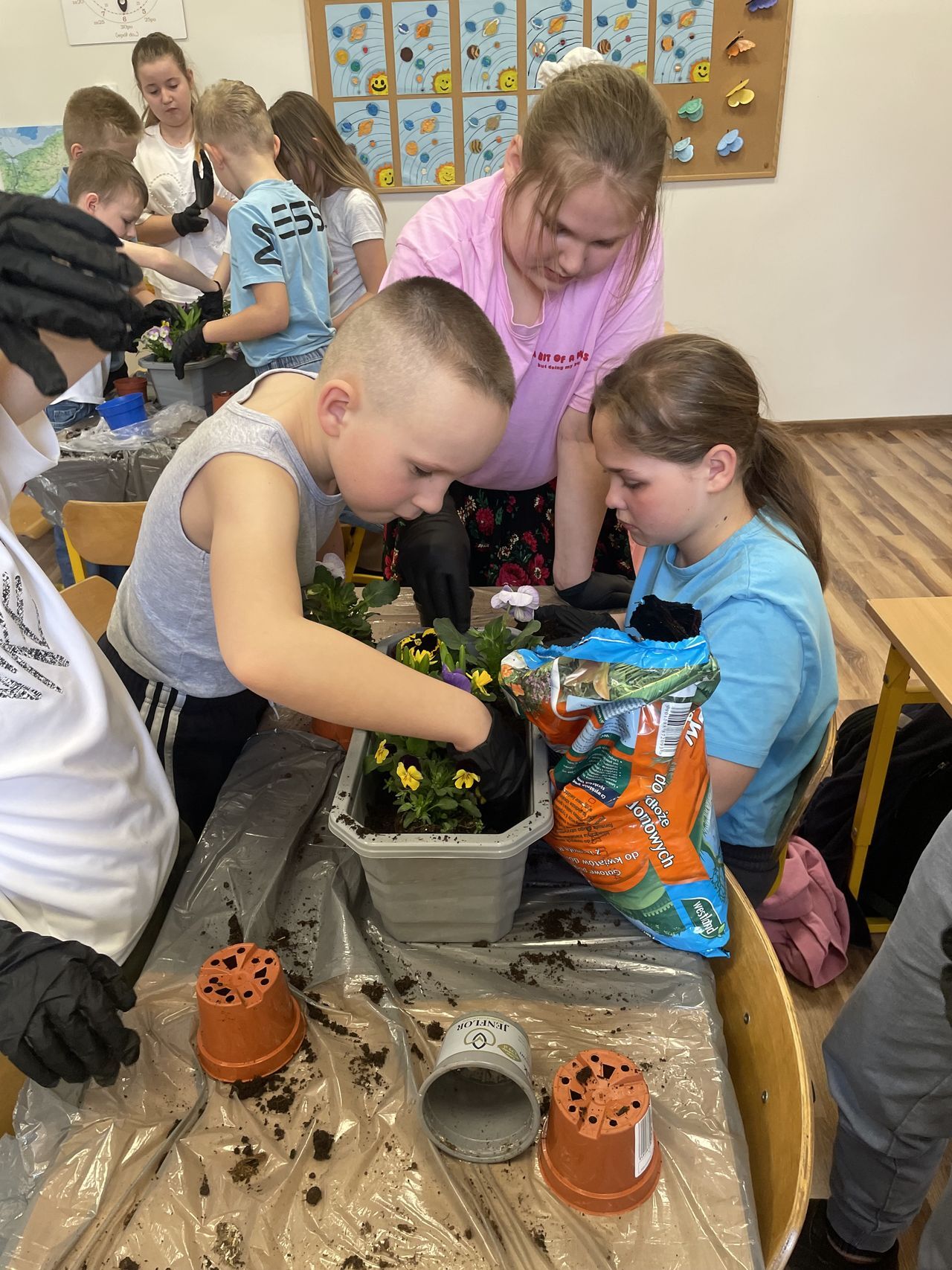Obchody rozpoczęły się w klasach, gdzie dzieci z wielkim zaangażowaniem sadziły wiosenne kwiaty. Uczniowie poznawali zasady pielęgnacji roślin oraz uczyli się, jak dbać o przyrodę. Kolorowe doniczki i świeża zieleń wprowadziły do sal lekcyjnych prawdziwie wiosenny nastrój.