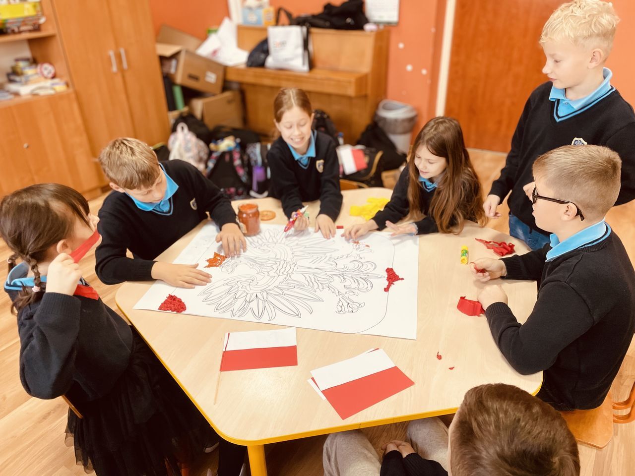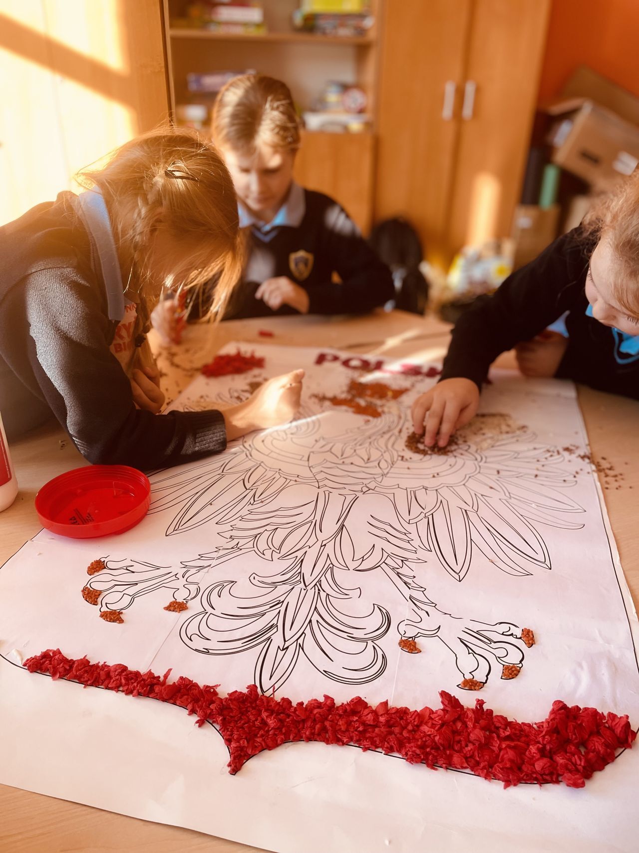 Dzień 11 listopada to ważna data dla każdego Polaka, będąca symbolem miłości do Ojczyzny, walki o wolność, wiarę w zwycięstwo. Uczniowie uczęszczający do świetlicy szkolnej przez kilka dni przygotowywali się do uczczenia Święta Niepodległości. W czasie zajęć tematycznych w świetlicy odbyły się pogadanki dotyczące tradycji obchodów tego święta i jego symboliki. Dzieci poznały historię Polski, jej kształt, granice i najbliższych sąsiadów. Podczas zajęć plastycznych wykonywały prace dotyczące symboli naszej państwowości, m.in. biało- czerwone flagi, godło z białym orłem w koronie.