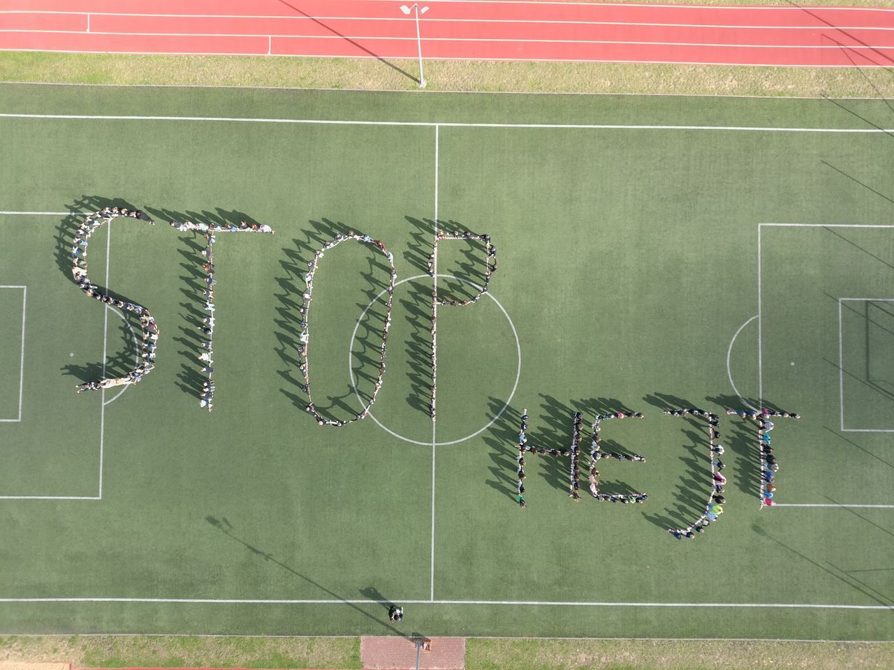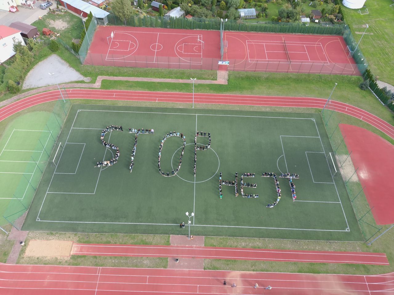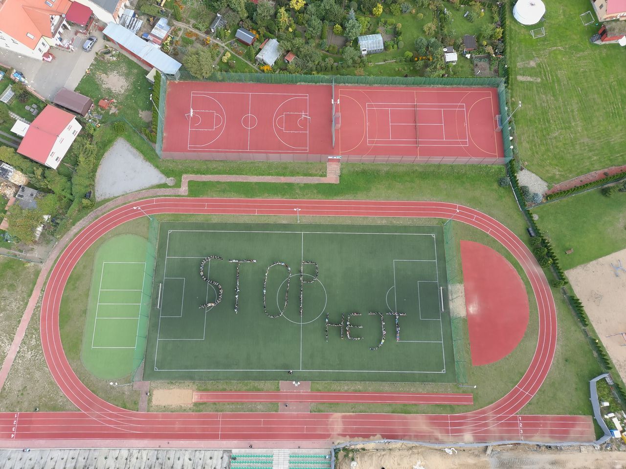 Tydzień rozpoczęliśmy od tematycznej gazetki poświęconej różnym formom przemocy i sposobom jej przeciwdziałania. Dzięki wsparciu OSP w Pełczycach wykonano wyjątkowe zdjęcie z drona, na którym uczniowie utworzyli napis „Stop Hejt” – symbol jedności całej społeczności szkolnej w walce z przemocą i hejtem.