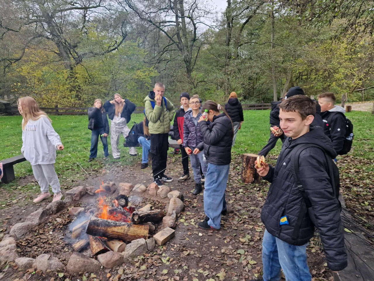 Po aktywnościach przyszedł czas na odpoczynek przy wspólnym ognisku. Pieczenie kiełbasek w gronie rówieśników było doskonałym zakończeniem wycieczki i okazją do rozmów oraz wspólnej zabawy.