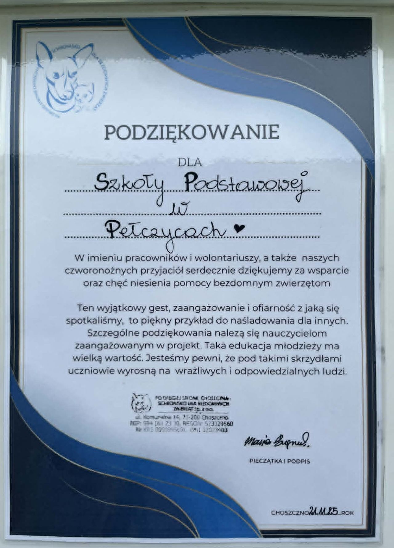 Uczniowie klasy piątej wybrali się ostatnio z wizytą do schroniska dla bezdomnych zwierząt w Choszcznie, aby lepiej poznać potrzeby czworonożnych podopiecznych oraz wesprzeć placówkę w jej codziennej pracy. Wyjazd był poprzedzony zbiórką karmy, koców oraz podstawowych akcesoriów potrzebnych do opieki nad zwierzętami.