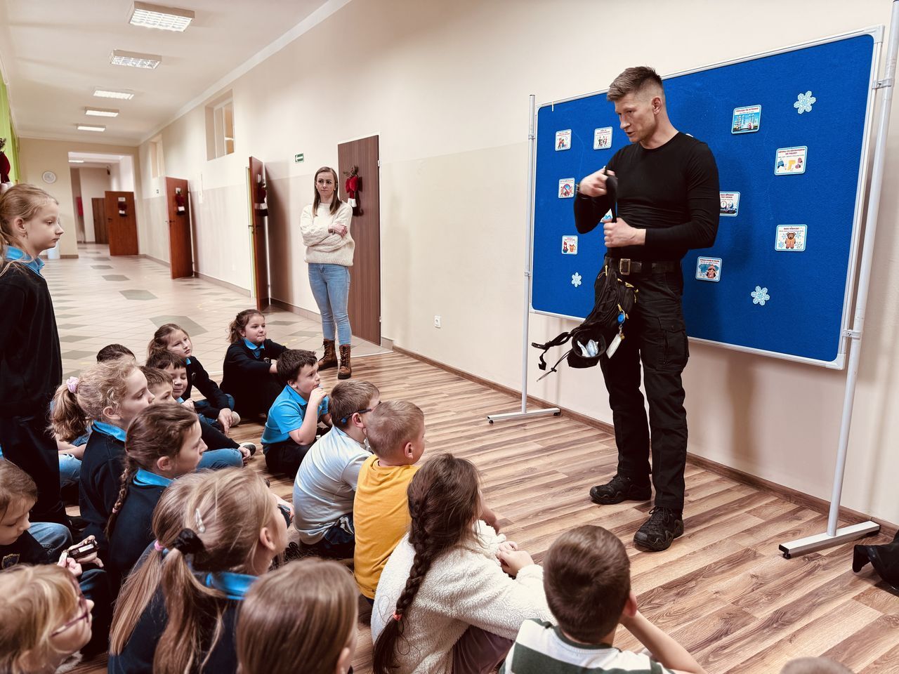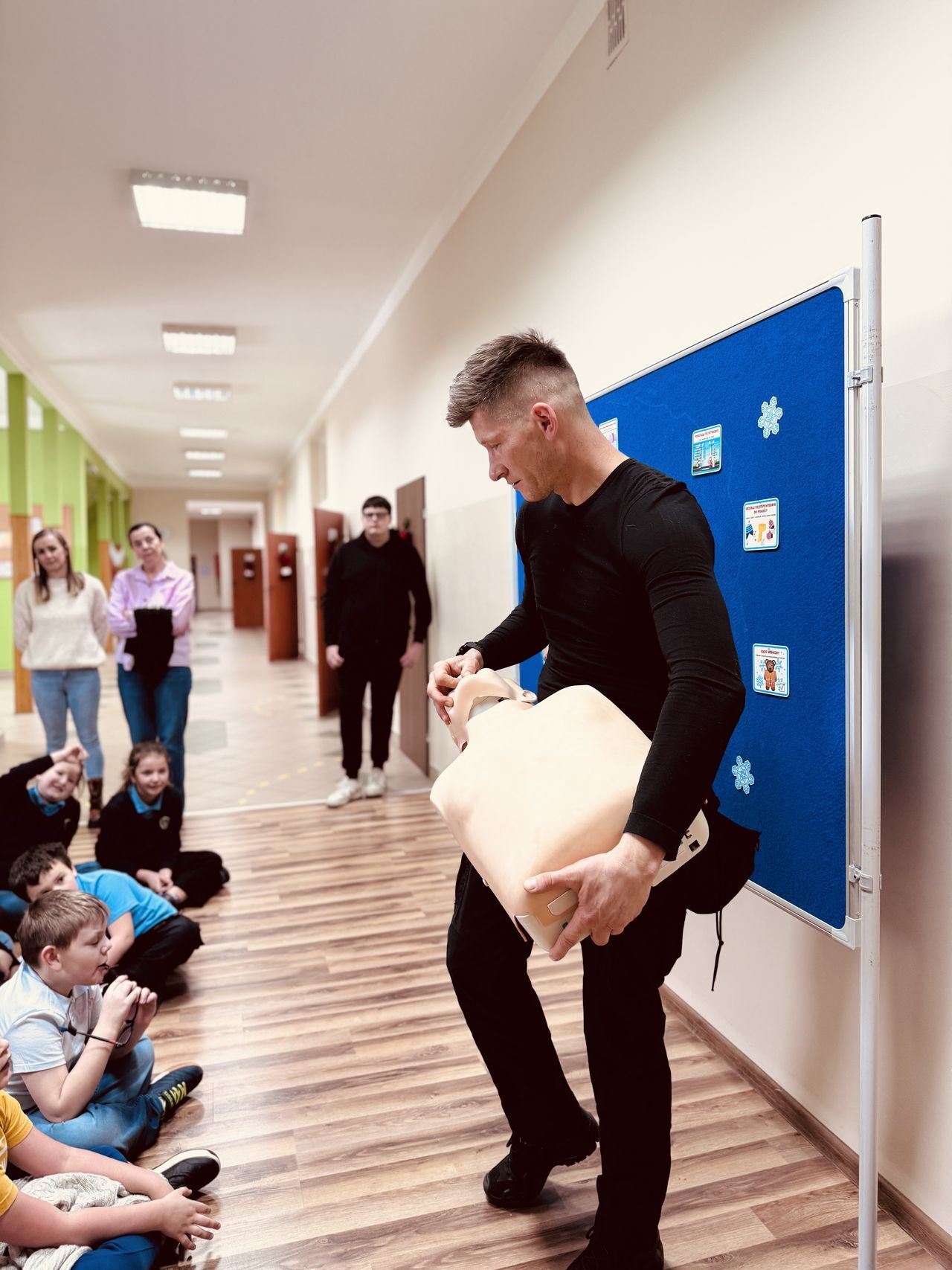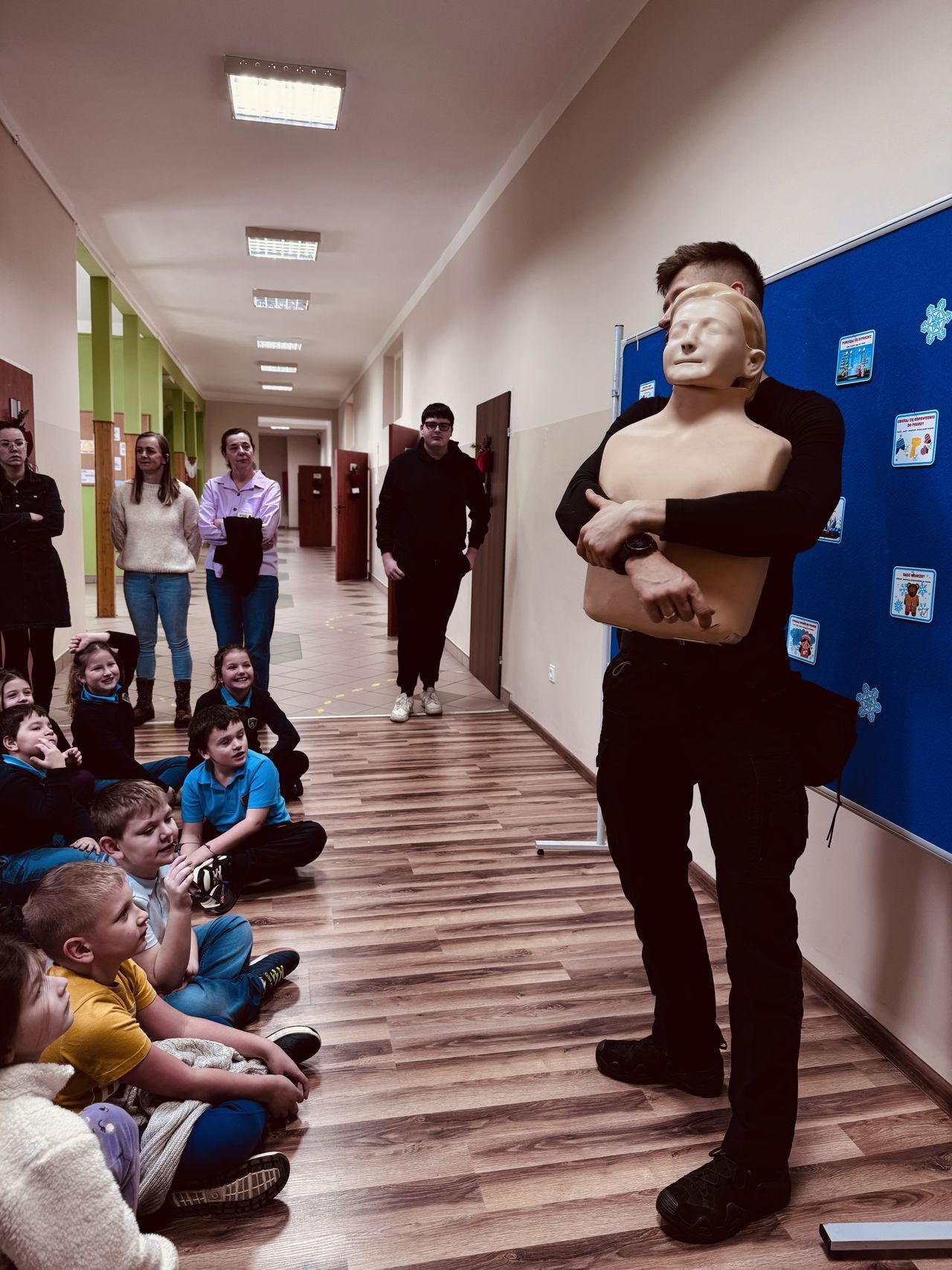 Dopełnieniem wydarzenia było spotkanie ze strażakiem, panem Marcinem Małyszem-Gortychem, który uzupełnił przekazane informacje oraz w praktyczny sposób zaprezentował podstawy pierwszej pomocy.