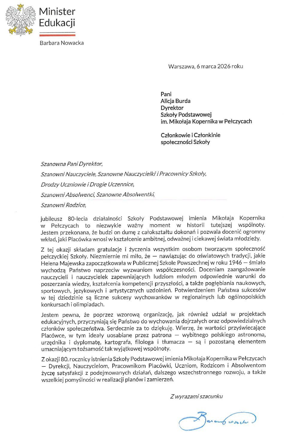 Świętowanie 80 lat istnienia Szkoły Podstawowej im. Mikołaja Kopernika w Pełczycach to czas wspomnień, wzruszeń i… miłych niespodzianek. Do licznych życzeń, które spłynęły do nas od absolwentów i przyjaciół, dołączyły te nieoczekiwane – od Pani Minister Barbary Nowackiej. To ogromny zaszczyt wiedzieć, że codzienna praca naszych nauczycieli i sukcesy uczniów są dostrzegane i doceniane. Poniżej publikujemy treść listu, który jest dla nas najpiękniejszym prezentem urodzinowym.