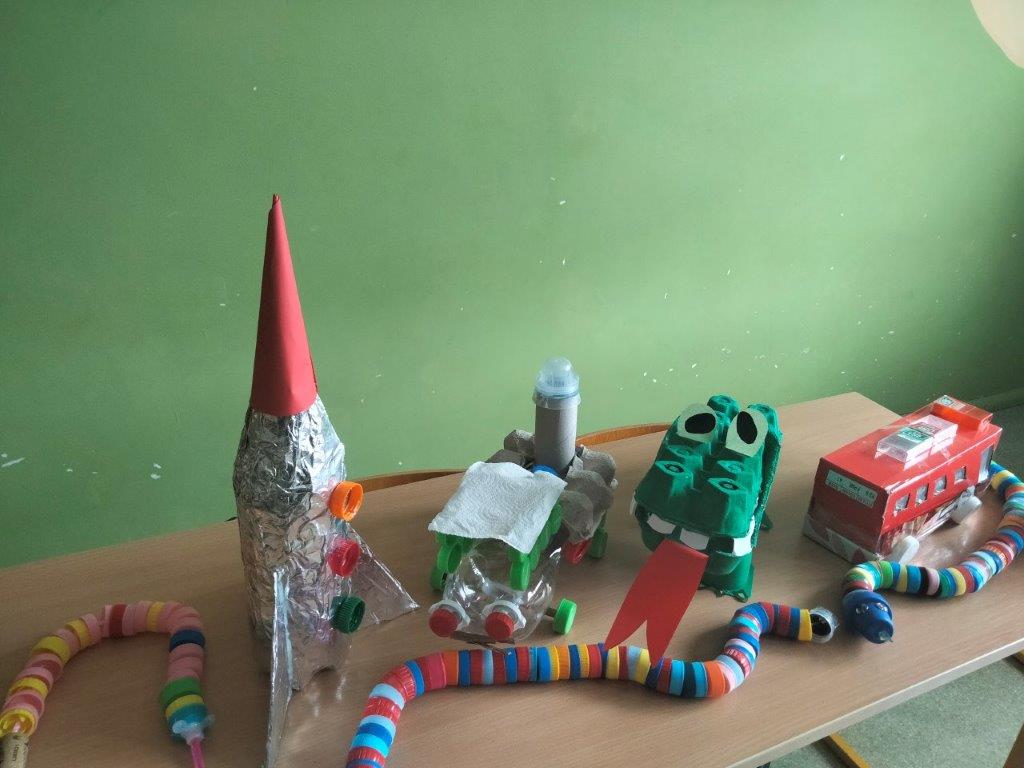 Uczniowie pod opieką swoich wychowawców obejrzały filmy edukacyjne oraz zapoznały się z symbolami ekologicznymi. Podczas przerw rozwiązywały krzyżówki, rebusy, łamigłówki, kodowały na macie i uczyły się segregować śmieci. Odbył się również klasowy konkurs zabawek wykonanych z odpadów przyniesionych przez dzieci. Prace były ciekawe i pomysłowe, co da się zauważyć na pierwszy rzut oka na zamieszczonych zdjęciach.